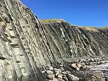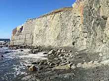 In 2000, the cliffs at Green Point were approved as the Global Stratotype Section and Point for the base of the Ordovician system by the International Union of Geological Sciences. The boundary is a section 60m thick composed of layers of shale and limestone with overturned beds dipping 60-70 degrees to the South East. It is marked by the first appearance of Iapetognathus fluctivagus, a conodont fossil, 4.8m below the earliest known planktic graptolite fossil, Rhabdinopora praeparabola.[2]