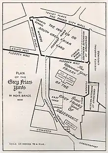 By 1565, all the buildings of the Friary had been removed and their stones carried away for use in the construction of the New Tolbooth and to repair St Giles' and its kirkyard walls.[10] The kirkyard of St Giles' was, by then, overcrowded and Mary, Queen of Scots had, in 1562, given the grounds of the Friary to the town council to use as a burial ground.[11]