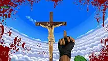 After returning to Earth and killing countless others, Piro initiates a plan to kill Jesus Christ in his infancy, thereby preventing the creation of Christianity. Piro infiltrates the womb of the Virgin Mary and slays the gestating Jesus within. An egg opportunistically appears where Jesus dies, which Piro fertilizes with his semen. From this egg a new Piro is born, who graphically bursts out of the Virgin Mary, killing her. The reborn Piro pulls out a banjo and plays a song for the Three Wise Men who stood at the Virgin Mary's side.[3]