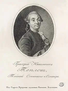 Grigory Nikolayevich Teplov (Russian: Григорий Николаевич Теплов; 20 November 1717 in Pskov, Tsardom of Russia – 30 March 1779 in Saint Petersburg, Russian Empire) was a Russian Imperial philosopher, composer, historian and academic administrator of lowly birth who managed the St. Petersburg Academy of Sciences and wielded influence over Little Russia in his capacity as secretary and advisor to Kirill Razumovsky (whose cousin he married).[1] He was also an amateur musician and in 1751 printed a collection of his songs entitled Idle Hours Away from Work.
