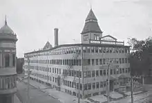 The R. B. Grover shoe factory was one of a number of shoe factories in Brockton, a town that had 35,000 shoe workers. The wooden building, shaped like a letter E, occupied half a city block at the corner of Main and Calmar Streets.[1] Grover made the popular Emerson brand shoe,[2] and business had been good enough to add a fourth floor.