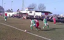 Guernsey started their second League campaign in August when they played Croydon with an 8–0 win in the Combined Counties Football League Premier Division after securing promotion in the previous season.[7] They also entered the FA Vase for the first time.[10] Sky Sports returned to Footes Lane to film the Semi final first leg against Spennymoor Town on 23 March 2013. To get the pitch playable, a novel way to dry the pitch was tried, using a helicopter,[11] copying an idea tried in Melbourne, Australia, 50 years earlier.[12]