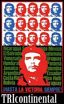 The stylized image of Che Guevara, adapted from Korda's photograph, is commonly accompanied by several different symbols that add context to its inherent suggested meaning. The most common of these are the red star,[65] hammer and sickle,[66] Cuban flag,[67] and the saying in Spanish "Hasta la Victoria Siempre"[68] (translation: "Towards Victory, Always"). The multi-meaning phrase became the sign off for Che Guevara's numerous letters and speeches as a revolutionary,[69] and represent the commitment to both never give up on the eventual triumph of a Marxist world revolution, and the belief that this victory once it occurs, will be eternal. As a result, "Hasta la Victoria Siempre" has become a de facto slogan or catchphrase,[70] used as a motto by those who continue to support and/or admire Che Guevara's life and/or ideals.[71]