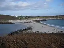 Gugh (/ɡjuː/ GHEW; Cornish: Keow, lit. 'hedge banks')[1] could be described as the sixth inhabited island of the Isles of Scilly, but is usually included with St Agnes with which it is joined by a sandy tombolo known as "The Bar" when exposed at low tide. The island is only about 1 km (0.62 mi) long and about 0.5 km (0.31 mi) wide, with the highest point, Kittern Hill at 34 m (112 ft).[2] The geology consists of Hercynian granite with shallow podzolic soils on the higher ground and deeper sandy soils on the lower ground. The former Gugh farm is just north of the neck across the middle of the island between the two hills. The two houses were designed and built in the 1920s by Charles Hamlet Cooper.[3] The name is often mispronounced as "Goo", "Guff" or even "Gogh".