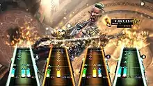 As with Guitar Hero World Tour, Guitar Hero 5 supports the playing of lead and bass guitar through guitar controllers, drums through a drum controller, and vocals through a microphone. Players can also play in groups of up to four local or remote players to form a band, co-operatively playing through a song. Whereas in World Tour, a band could only have one of each instrument, Guitar Hero 5 allows players to arrange for any combination of instruments, including all four players on the same instrument if they so choose.[4] While playing in a band, Star Power is now tracked separately for each player, as opposed to collectively for the band as in World Tour.[5] A new play mechanic called "Band Moments" will require all members of the band to play sections of a song successfully to gain rewards, both in a temporary scoring multiplier and visual effects on screen.[6][7] The Band Revival meter will appear when a player fails out of the song, requiring the other band members to play well as a group together in order to bring the failed player back into the game. Failing to do so will end the song prematurely.[7]