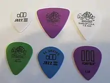 A guitar pick (American English) is a plectrum used for guitars. Picks are generally made of one uniform material—such as some kind of plastic (nylon, Delrin, celluloid), rubber, felt, tortoiseshell, wood, metal, glass, tagua, or stone. They are often shaped in an acute isosceles triangle with the two equal corners rounded and the third corner less rounded. They are used to strum chords or to sound individual notes on a guitar.