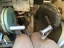 Manual traverse for an Eland armoured car. Gun elevation is controlled by the left traverse wheel, horizontal turret rotation by the right.