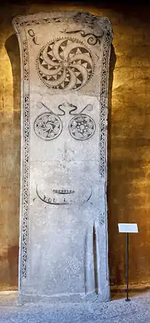 The saga begins with Gotland being discovered by a man named Þieluar (Tjalve) (Gutnish: Tjelvar). He was a mythical figure who shows up twice in the Prose Edda and once in Gutasaga. Gotland is under a spell and under water during the day and out of water only during the night, a spell that is broken by Þieluar lighting a fire on the island.[2] Þieluar's son Hafþi (Havde) and his wife Vitastjerna (Gutnish: Hwitastierna; English: White Star) had three sons named Graip, Gute and Gunfjaun, the ancestors of the Gutes. After Havde's and Vitastjerna's first night together, she had a dream about three snakes entwined in her bosom. This was interpreted as a symbol that all things are connected in circles and that they would have three sons. The subject is depicted on some of the picture stones on Gotland.[3]