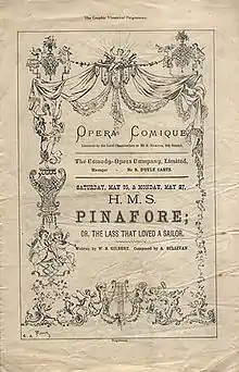 In 1875, Richard D'Oyly Carte, who was then managing the Royalty Theatre for Selina Dolaro, brought Gilbert and Sullivan together to write their second show, a one-act opera entitled Trial by Jury.[1] This proved a success, and in 1876 D'Oyly Carte assembled a group of financial backers to establish the Comedy Opera Company, which was devoted to the production and promotion of family-friendly English comic opera.[2] With this theatre company, Carte finally had the financial resources, after many failed attempts, to produce a new full-length Gilbert and Sullivan opera.[3] This next opera was The Sorcerer, which opened in November 1877. It too was successful, running for 178 performances.[4] Sheet music from the show sold well, and street musicians played the melodies.[5]