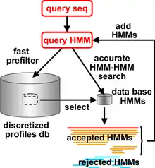 HHblits, a part of the HH-suite since 2001, builds high-quality multiple sequence alignments (MSAs) starting from a single query sequence or a MSA. As in PSI-BLAST, it works iteratively, repeatedly constructing new query profiles by adding the results found in the previous round. It matches against a pre-built HMM databases derived from protein sequence databases, each representing a "cluster" of related proteins. In the case of HHblits, such matches are done on the level of HMM-HMM profiles, which grants additional sensitivity. Its prefiltering reduces the tens of millions HMMs to match against to a few thousands of them, thus speeding up the slow HMM-HMM comparison process.[3]