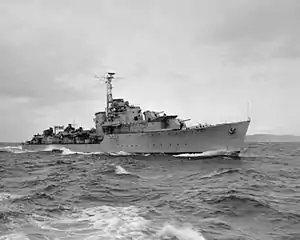 In 1953, Crescent underwent a conversion to destroyer escort.[18] She was modernised for anti-submarine warfare and to serve as a fast fleet escort, similar to the Type 15 frigate of the Royal Navy, the second Canadian warship to so. The superstructure was extended aft, and the bridge was modified. Half of her gun armament was replaced by sonar, a Mark 10 Limbo anti-submarine mortar and homing torpedoes.[2] The project was considered the largest operation undertaken by a Canadian dockyard to that point.[18] While under refit, Crescent was assigned to the Second Canadian Escort Squadron on 1 January 1955.[19] The ship was recommissioned on 31 October 1955, followed by three months of extensive sea trials.[20] In 1959, she was used as a test bed for the new variable depth sonar and was eventually permanently installed.[2][21]