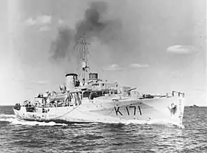 Flower-class corvettes like Kamsack serving with the Royal Canadian Navy during the Second World War were different from earlier and more traditional sail-driven corvettes.[3][4][5] The "corvette" designation was created by the French as a class of small warships; the Royal Navy borrowed the term for a period but discontinued its use in 1877.[6] During the hurried preparations for war in the late 1930s, Winston Churchill reactivated the corvette class, needing a name for smaller ships used in an escort capacity, in this case based on a whaling ship design.[7] The generic name "flower" was used to designate the class of these ships, which – in the Royal Navy – were named after flowering plants.[8]