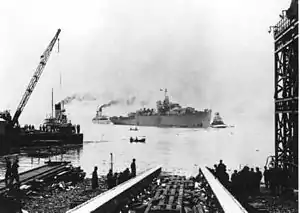 The River-class frigate was designed by William Reed of Smith's Dock Company of South Bank-on-Tees. Originally called a "twin-screw corvette", its purpose was to improve on the convoy escort classes in service with the Royal Navy at the time, including the Flower-class corvette. The first orders were placed by the Royal Navy in 1940 and the vessels were named for rivers in the United Kingdom, giving name to the class. In Canada they were named after towns and cities though they kept the same designation.[5] The name "frigate" was suggested by Vice-Admiral Percy Nelles of the Royal Canadian Navy and was adopted later that year.[6]