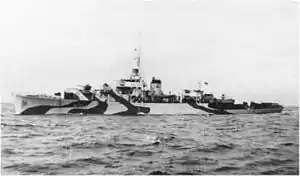After working up at Pictou, Prince Rupert was assigned to the Mid-Ocean Escort Force escort group C-3 as Senior Officer's Ship. She was used a trans-Atlantic convoy escort until November 1944.[2] On 13 March 1944, Prince Rupert, alongside USS Haverfield, USS Hobson and aircraft from American and British services, sank U-575 in the North Atlantic.[3] When the U-boat was spotted by an RCAF patrol plane, Prince Rupert was detached from the convoy and sped to the sighting. There alongside the aforementioned units, she fought for five hours to sink U-575. In the end the U-boat surfaced and Prince Rupert helped carry off the survivors, saving fourteen of the sinking submarine's crew.[6]