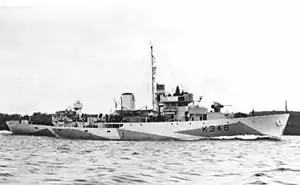 Flower-class corvettes like Whitby serving with the Royal Canadian Navy during the Second World War were different from earlier and more traditional sail-driven corvettes.[2][3][4] The "corvette" designation was created by the French as a class of small warships; the Royal Navy borrowed the term for a period but discontinued its use in 1877.[5] During the hurried preparations for war in the late 1930s, Winston Churchill reactivated the corvette class, needing a name for smaller ships used in an escort capacity, in this case based on a whaling ship design.[6] The generic name "flower" was used to designate the class of these ships, which – in the Royal Navy – were named after flowering plants.[7]