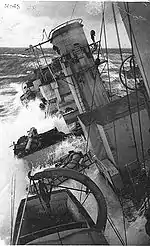 On 29 August, Boadicea was assigned to the 19th Destroyer Flotilla based at Dover where she escorted the troopships of the British Expeditionary Force through October. The ship was then transferred to the 22nd Destroyer Flotilla at Harwich for two months before rejoining the 19th Flotilla where she escorted convoys through the English Channel. On 4 March 1940, she towed the oil tanker Charles F. Meyer to Southampton Water after that ship struck a mine. Boadicea began a refit at Chatham Dockyard on 2 May and was not operational until she sailed for Le Havre, France on 9 June to assist in the evacuation of British troops before advancing German troops.[12] The next afternoon, she was severely damaged by Junkers Ju 87 "Stuka" dive bombers that knocked out her engines and boilers. After all depth charges and torpedoes were jettisoned to reduce her topweight and temporary repairs made to the holes in her hull, Boadicea was towed by the destroyer Ambuscade and the tugboat Krooman to Dover.[13]
