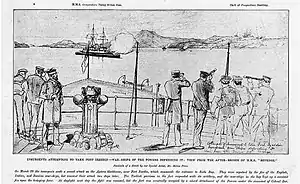 In 1897, Camperdown arrived off Crete to join the International Squadron, a multinational force made up of ships of the Austro-Hungarian Navy, French Navy, Imperial German Navy, Italian Royal Navy (Regia Marina), Imperial Russian Navy, and Royal Navy that intervened in the 1897–1898 insurrection of Cretan Christians against the Ottoman Empire. On 26 and 27 March 1897, she fired her guns in anger for the first time – including four 1,250-pound (570 kg) rounds from her 13.5-inch (343 mm) guns – bombarding Christian insurgents besieging the Ottoman-held Izzeddin Fortress near the entrance to Suda Bay. Firing at a range of 5,000 yards (4,600 m), she forced the insurgents to abandon their siege.[2][3] On 21 April 1897, she anchored off Canea (now Chania) – where Ottoman troops, Cretan Turk civilians, and a force of British and Italian soldiers were besieged by an estimated 60,000 insurgents – to deter insurgents who had begun a demonstration with two artillery pieces that threatened the town. In response to a violent riot by Cretan Turks at Candia (now Heraklion) the previous day, she arrived at Candia on 7 September 1898 to reinforce the occupation forces there and put a contingent of Royal Marines ashore.[4] After the local Ottoman governor refused to meet various British demands during a meeting aboard the British flagship, the battleship HMS Revenge, in Candia′s harbor on 13 September, Camperdown and Revenge conducted a demonstration that overcame his reluctance.[5][6]