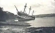 While her forepart planted firmly on the shelving shore her stern was floating in 30 feet of water. As the tide fell the stern lost its support causing the ship to become severely hogged. Her seams opened, and about her midship sections the height between decks was reduced from over 6 feet (1.8 m) to less than 4 feet (1.2 m). "Conditions on board were very bad with the after end of the ship from the mainmast sagging downwards, and the continuous sound of cracking, twisting, rending timber and rushing water below."[16] When the next tide made the stern failed to lift and the ship flooded freely through her open seams. Being evident that further attempts to tow the ship off would be to no purpose, the tugs were discharged and left for Liverpool the following morning. Two days after the grounding, in the evening of 16 April 1953, surveyors declared Conway a total constructive loss. The ship was not insured.