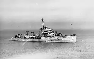 Between October 1940 and April 1941, Fury had her rear torpedo tube mount replaced by a 12-pounder (76 mm) AA gun.[4] During her early 1942 refit, two single 20 mm (0.8 in) Oerlikon light AA guns were installed abreast the bridge.[5] By July 1942, a Type 286 short-range surface-search radar was fitted as was a HF/DF radio direction finder mounted on a pole mainmast.[1] By February 1943 photographic evidence shows that a pair of Oerlikons had replaced her Vickers .50 machine guns. During her early 1944 refit, another pair of Oerlikons was added and her 12-pounder gun was removed.[5] Photos taken of the ship in July 1944 show her with a Type 271 radar mounted on her searchlight platform that was probably installed during her last refit.