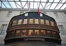 Unlike the unfortunate Wellesley, Implacable survived the Second World War. Still, the Admiralty scuttled her by an explosive charge on 2 December 1949. A fireboat towed her to a spot east of the Isle of Wight and she sank into Saint Catherine's Deep, about five miles from Ventnor. Implacable was by then the second-oldest ship of the Navy after Victory, and there were heavy protests against her disposal. However, given the postwar austerity the British decided against the cost of her restoration, which was estimated at £150,000 with another £50,000 for re-rigging.[18][lower-alpha 4] In 1947 they had offered her to the French, who too declined to spend the money to turn her into a museum. Still, her figurehead and stern galleries were saved and are on display in the National Maritime Museum at Greenwich, while her capstan is on display at the maritime museum at Rochefort. The doors to the Captain's cabin are in the collection of the museum ship HMS Unicorn, Dundee. Public reaction to the "criminal action against the maritime history of Britain" forced the government to support the preservation of Cutty Sark.[19]