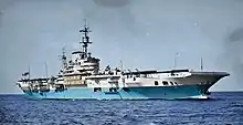 Implacable was recommissioned on 16 January 1952 as the flagship of the Home Fleet Training Squadron.[39] On 13 February she arrived at Dover to serve as the port's guard ship before and after the state funeral of King George VI, to salute royalty and heads of state arriving by sea. After its conclusion, the ship sailed for the western Mediterranean to rendezvous with her sister for exercises. In June the two sisters represented a fast troop convoy being attacked by aircraft during an air defence exercise. They visited Copenhagen in the next month before returning home. Implacable sailed for Gibraltar on 25 September and made a port visit to Lisbon, Portugal, before returning to Devonport for a refit. On 16 November she had an oil fire in her galley that damaged her electrical wiring badly enough to require extending her refit to 20 January 1953. She spent most of February and March in the western Mediterranean together with her sister, participating in exercises before sailing to Southampton for a brief refit.[40]