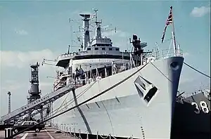 Intrepid was refitted at Devonport Royal Dockyard between January 1984 and June 1985,[2] with two Sea Cat launchers removed, with twin 30 mm anti-aircraft mounts and two single 20 mm cannon added.[3] From June 1985 until 1990 she supported the sea training phase of initial officer training, undertaken at Britannia Royal Naval College, as part of the Dartmouth Training Squadron. During the same period Intrepid also provided Marine Engineering Artificer Apprentices from HMS Sultan their sea training opportunity. During a three to four-month period, each entry of Artificers would spend a week working in each department aboard in order to learn more about the other trades in the Royal Navy.