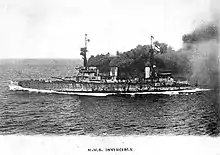 She was commissioned into the 1st Cruiser Squadron of the Home Fleet on 20 March 1909 and participated in fleet manoeuvres in April and June 1909, the Spithead Review on 12 June 1909,[15] and the Fleet Review off Southend on 2 July. She was refitted between 17 August and 17 January 1910 in an attempt to cure the electrical problems with her turrets, but they were still unsatisfactory. Another attempt was made to bring her turrets to working order during a refit in the spring of 1911, but this too was unsuccessful and the decision was made the following year to convert her turrets to hydraulic power. This was delayed until after her deployment to join the Mediterranean Fleet in August 1913. On 17 March 1913, she collided with the submarine C34, but the collision was ruled the fault of the submarine. She returned to the UK in December 1913 in preparation for a major refit that would finally give her turrets hydraulic power and make her battle-worthy.[16]