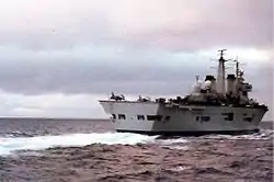 Invincible's initial air wing consisted of 801 Naval Air Squadron, equipped with five Sea Harriers and 820 Naval Air Squadron, equipped with Sea King anti-submarine helicopters.[18] In August–September 1981, Invicible took part in the NATO naval exercises "Ocean Venture" and "Ocean Safari".[7][19]