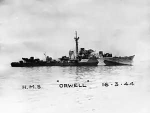 On 23 April 1944, the 17th Flotilla, including Orwell, deployed to Plymouth to prepare for the upcoming Allied invasion of France.[36] On the night of 27/28 April 1944, nine German S-boats (motor torpedo boats) attacked a convoy of American landing craft on exercise in Lyme Bay, sinking two and damaging another. Orwell and sister-ship Offa clashed with the withdrawing S-boats after the attack, but the German boats managed to escape unharmed behind a smoke-screen.[36][37][38] The Invasion of Normandy on 6 June 1944, saw Onslow patrolling to the east of the invasion area.[36][39] Orwell remained on duties protecting the Normandy beachhead and invasion traffic until September, when she rejoined the Home Fleet.[36] Later that month. Orwell and Obedient escorted the cruiser Jamaica on another supply run to Svalbard.[40] From 22 to 28 October Orwell formed part of the escort for Arctic Convoy JW 61, and she sailed with the return convoy RA 61 from 2 to 7 November 1944.[41] On 29 November 1944, Orwell collided with the submarine Volatile, sustaining minor damage.[36] The damage sustained did not prevent Orwell from joining the escort for Convoy JW 62 on 1 December 1944, or from escorting the return convoy, RA 62 from 10 to 18 December 1944.[42]