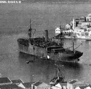 HMS Raven II was a seaplane carrier of the Royal Navy used during the First World War. Converted from the captured German freighter Rabenfels, the ship's aircraft conducted aerial reconnaissance, observation and bombing missions in the Eastern Mediterranean and Red Sea during 1915–17 even though the ship was not commissioned into the Royal Navy until mid-1915. She fruitlessly searched the Indian Ocean for the German commerce raider Wolf in mid-1917. Raven II was decommissioned in late 1917 and became a Merchant Navy collier for the last year of the war. She was sold off in 1923 and had a succession of owners and names until she was sunk during the Second World War while under Japanese ownership.