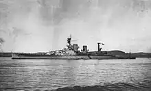 Repulse was recommissioned on 1 January 1921 and joined the Battlecruiser Squadron of the Atlantic Fleet. In November 1923, Hood, accompanied by Repulse and a number of Danae-class cruisers of the 1st Light Cruiser Squadron, set out on a world cruise from west to east via the Panama Canal. They returned home ten months later in September 1924.[11] Shortly after her return the ship's two three-inch AA guns and her two single four-inch gun mounts were removed and replaced with four QF four-inch Mark V AA guns.[18] The Battlecruiser Squadron visited Lisbon in February 1925 to participate in the Vasco da Gama celebrations before continuing on to the Mediterranean for exercises.[19] A squash court was added on the starboard side between the funnels, and a sauna and bubble bath on the quarterdeck for the Prince of Wales' tour of Africa and South America[18] that lasted from March to October.[20] Upon her return, she was refitted from November 1925 to July 1926 and had a high-angle control position (HACP) added to her fore-top.[18]