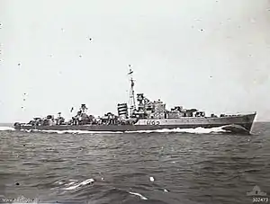 During the Battle of Sept-Îles, Rocket encountered German torpedo boats in the English Channel in October 1943, an action in which the cruiser Charybdis and destroyer Limbourne were lost. The latter was sunk by Rocket after she became disabled, to avoid her falling into enemy hands. On 29 November 1943 HMS Rocket and HMS Tumult, sank U-86 east of the Azores, in position 40°52'N, 18°54'W, by depth charges.[2] Arriving in the Indian Ocean in January 1944, Rocket participated in the shelling of Sabang (25 July 1944) and of the Andaman Islands (February and March 1945).