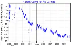 HR Carinae undergoes spectral variations apparently correlated with the light variations similarly to other luminous blue variables. It has undergone several outbursts during which the visual brightness increases and the temperature drops, but the bolometric luminosity remains approximately constant. The visual brightness increased erratically but consistently during the later decades of the 20th century to a record peak of mag 6.8, then dropped straight to a record minimum of mag 8.8 by 2010.[9]