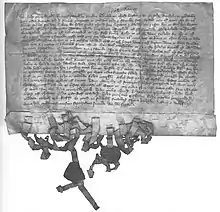 In 1349, the Black Death was brought to Bergen on board an English merchant ship to devastating effects, killing between 50% and 60% of the population,[46] leaving the kingdom in a period of social and economic decline.[47] The kingdom's financial framework (which was originally weak) virtually collapsed as the plague ravaged through the realm, and the aggressive foreign policies of Haakon would in addition take a heavy toll on the kingdom's decaying economy.[9][47][48][49] In 1371, Haakon acquired the release of his father from German imprisonment against a large ransom sum of 12,000 silver marks, which alone was more than the kingdom's ordinary tax incomes just before the outbreak of the plague. A special tax had to be imposed on Haakon's subjects to pay for the ransom.[50] In 1379, Haakon resolved the succession dispute over the Earldom of Orkney, a Norwegian dignity located within the Kingdom of Scotland. On 2 August the same year, at Marstrand near Tønsberg, Haakon invested and confirmed the title of Earl of Orkney upon Henry Sinclair, Baron of Roslin (a grandson of Maol Íosa V, Earl of Strathearn) over the rival claim of Sinclair's cousin, Malise Sparre. In return, Sinclair pledged to pay a sum of 1000 nobles before 11 November the same year, and when called upon, was to serve the Norwegian king on Orkney or elsewhere with 100 equipped and armed men for up to three months. As a security for upholding this arrangement, Sinclair had to leave behind valued hostages when he departed for his earldom. It is unknown if Haakon ever attempted to call upon the forces pledged by Sinclair, or if the agreed sum was ever actually paid in full. Shortly before his death in 1380, Haakon permitted the hostages to return home.[49][51][52] Furthermore, throughout Haakon's reign he reportedly had an unproblematic relationship with the church. Also, throughout his rule, especially after the loss of Sweden to the Germans, a noticeable number of Swedish noblemen pledged their support to Haakon and settled on Norwegian lands. The generally accepted reason was because of their displeasure towards the German usurper and his favoritism towards his own kinsmen.[49] Curiously enough, German noblemen from Mecklenburg reportedly entered the service of Haakon during his reign.[3]
