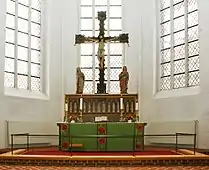The present high altar was added to the church during the renovations of 1941-51. The altar table was designed by Lønborg Jensen. A medieval top with incisions was also added. The crucifix above the altar dates from the 1300s brought over from Egebjerg in Odsherred. The cross includes the four symbols of the evangelists. The cross also features the figures Mary and John dating from the 1400s and originated from Seem Church near Ribe. The figures of the twelve apostles date from the 1400s and were previously located in Hertug Hans Hospitalskirke in Haderslev.