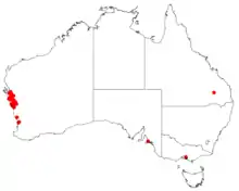 Hakea bucculenta is endemic to coastal areas in the Gascoyne and Mid West regions between Shark Bay and Geraldton in Western Australia. Grows on coastal sand plain heath or mallee, roadsides verges in sandy, loam or clay-based soils.[11]