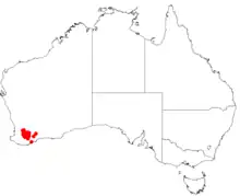 This hakea is endemic an area in the Wheatbelt and Great Southern regions of Western Australia from around Pingelly in the north to Albany in the south and has a scattered distribution. The shrub is found on and around hills and grows in sandy, loamy or clay soils that can contain gravel.[2] It is usually part of a heath understorey community in Eucalyptus woodlands.[3]