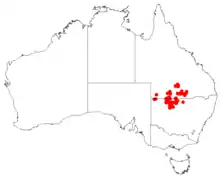 Scattered or growing in small groups on sand plains or loam in open arid woodland in the Bourke-Wanaaring districts and south-western Queensland.[4][5]