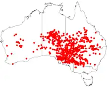 It is found in every state of Australia except Tasmania and is commonly known as a dry country species particularly arid and semi arid regions.[15]