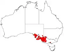 Desert hakea grows in mallee-heath vegetation on calcareous sandy soil. Mainly a South Australian species occurring on Eyre, Yorke and Fleurieu Peninsulas, Kangaroo Island and south of the Murray River to Naracoorte, extending into western Victoria.[3][5]