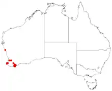This species is found in the south-west from Bunbury and Busselton to the Stirling Range growing in well-drained rocky loam or clay over ironstone in winter-wet sites.[7]