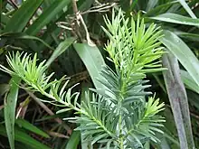 The leaves of the younger trees and on the lower branches of the adults are narrow and to some extent leathery, up to 4 cm long and 3 mm wide. The adult leaves are thick, scale-like and much smaller; the leaves overlap and lie appressed to the branchlets in 4 rows.