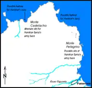 Hamilcar next raided Locri in Bruttium and the area around Brindisi in 247 BC.[25] On his return he seized a strong position on Mount Ercte (Monte Pellegrino, just north of Palermo or Mt. Castellacio, 7 miles north-west of Palermo),[26] and not only maintained himself against all attacks, but carried on with his seaborne raids ranging from Catana[27] in Sicily to as far as Cumae in central Italy.[28][29] He also set about improving the spirit of the army, and succeeded in creating a highly disciplined and versatile force. While Hamilcar won no large-scale battle or recaptured any cities lost to the Romans, he waged a relentless campaign against the enemy, and caused a constant drain on Roman resources. However, if Hamilcar had hoped to recapture Panormus, he failed in his strategy. Roman forces led by the consuls Marcus Otacilius Crassus and Marcaus Fabius Licinus achieved little against Hamilcar in 246 BC, and the consuls of 245 BC, Marcus Fabius Bueto and Atilius Bulbus, fared no better.