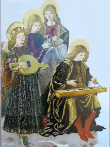 An early version of the hammered dulcimer accompanied by lute, tambourine and bagpipe