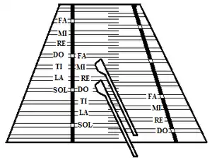 The strings of the hammered dulcimer are often tuned according to a circle of fifths pattern.[3][4] Typically, the lowest note (often a G or D) is struck at the lower right-hand of the instrument, just to the left of the right-hand (bass) bridge. As a player strikes the courses above in sequence, they ascend following a repeating sequence of two whole steps and a half step. With this tuning, a diatonic scale is broken into two tetrachords, or groups of four notes. For example, on an instrument with D as the lowest note, the D major scale is played starting in the lower-right corner and ascending the bass bridge: D – E – F – G. This is the lower tetrachord of the D major scale. At this point the player returns to the bottom of the instrument and shifts to the treble strings to the right of the treble bridge to play the higher tetrachord: A – B – C – D. The player can continue up the scale on the right side of the treble bridge with E – F – G – A – B, but the next note will be C, not C, so he or she must switch to the left side of the treble bridge (and closer to the player) to continue the D major scale. See the drawing on the left above, in which "DO" would correspond to D (see Movable do solfège).