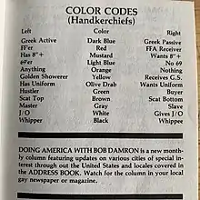 The handkerchief code (also known as the hanky code, the bandana code, and flagging)[1] is a system of color-coded cloth handkerchief or bandanas for non-verbally communicating one's interests in sexual activities and fetishes. The color of the handkerchief identifies a particular activity, and the pocket it is worn in (left or right) identifies the wearer's preferred role in that activity. Wearing a handkerchief on the left side of the body typically indicates one is a "top" (considered active in the act/fetish indicated by the color of the handkerchief) while wearing it on the right side of the body would indicate one is a "bottom" (considered passive in it). For example, a dark blue handkerchief indicates an interest in anal sex, and wearing it in the left pocket indicates a preference for being the penetrating partner. The code was most widely used in the 1970s in the United States, Canada, Australia, and Europe, by gay and bisexual men seeking casual sex, or BDSM practitioners.