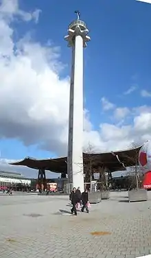 The Hermesturm (Hermes Tower) is a tower built of two concrete tubes on the fairground. The building was constructed between 1956 and 1958. Its total height, including the antenna, is 88.8 m, an observation deck at 65 m can be reached with an elevator.