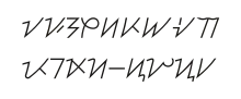 It is an abugida descended from the Brahmic scripts, closely related to Sulat Tagalog, and is famous for being written vertical but written upward, rather than downward as nearly all other scripts (however, it is read horizontally left to right). It is usually written on bamboo by incising characters with a knife.[3][4] Most known Hanunó'o inscriptions are relatively recent because of the perishable nature of bamboo. It is therefore difficult to trace the history of the script.[2]