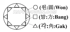 The symbol represents the principles of Hapkido's concept and technique in the form of 원 (won, circle), 방(bahng, square), and 각(gahk, triangle). Won represents the heaven (or universe), bahng within the won represents the earth, and the gahk represents a man. As the logo shows, the earth is contained within the universe and the earth is surrounded by men. The symbol is the unification of the universe, the earth and the man: this is the Hapkido's accord and principle.[10]