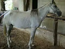 In extreme old age, such as when a horse is over 30 years old, the animal may no longer have any molars left, and may require a diet of mushy foods such as hay cubes soaked in water, beet pulp, or other specialized feeds.[2] In such cases, these horses will appear to be too thin, but if obtaining proper nutrition will still have a healthy hair coat, flesh over bone, and other indicators of good health.[5]